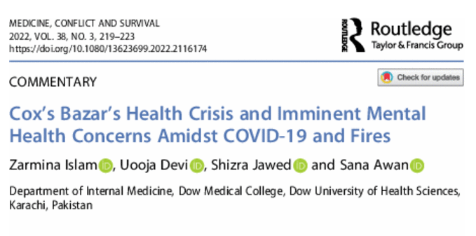 Cox’s Bazar’s Health Crisis and Imminent Mental Health Concerns Amidst COVID-19 and Fires Leave a Comment / Uncategorized / By admin Authors:Zarmina IslamUooja DeviShizra JawedSana Awan Article Type:CommentaryPublished in August 2022 in Medicine, Conflict, and Survival Read Full Text Here
